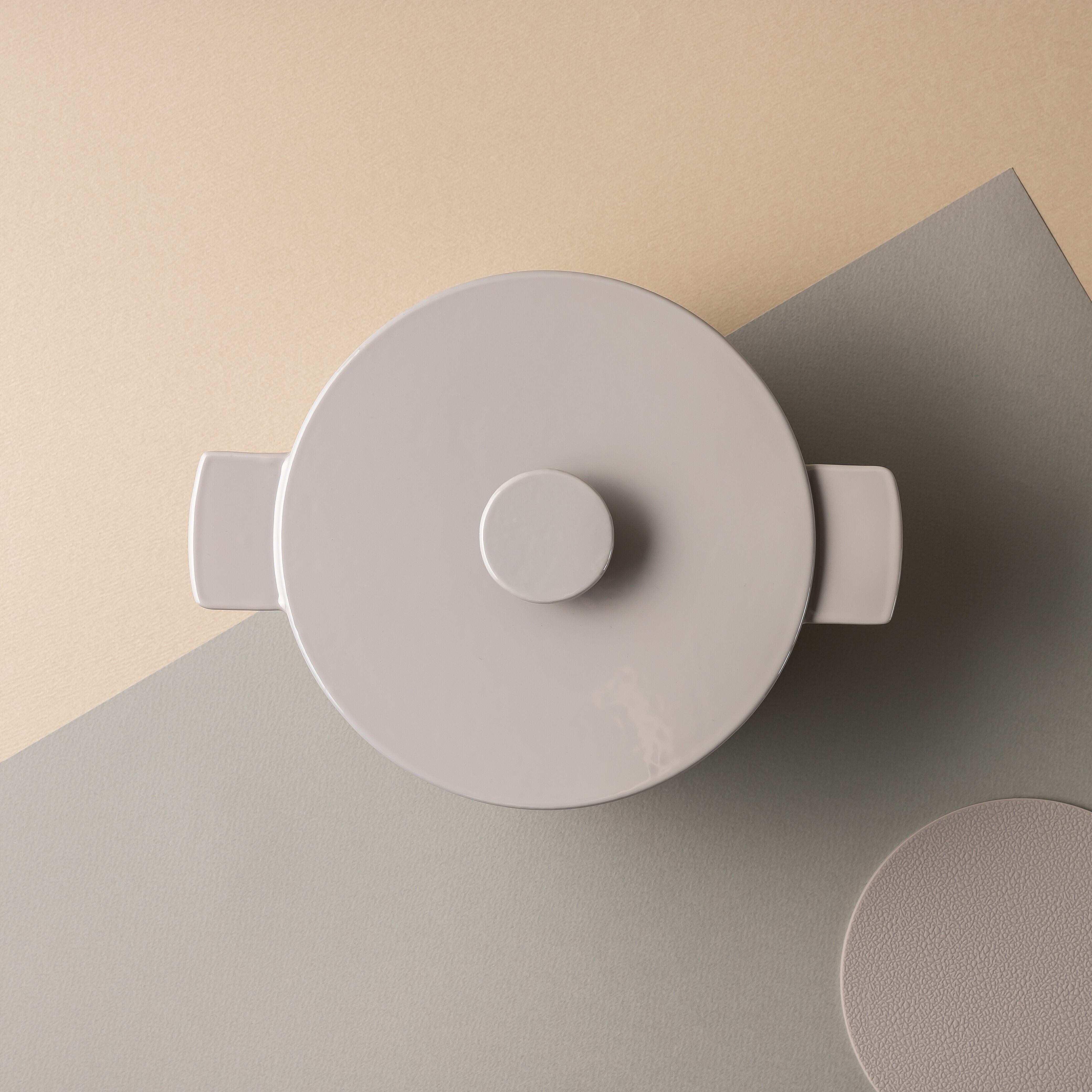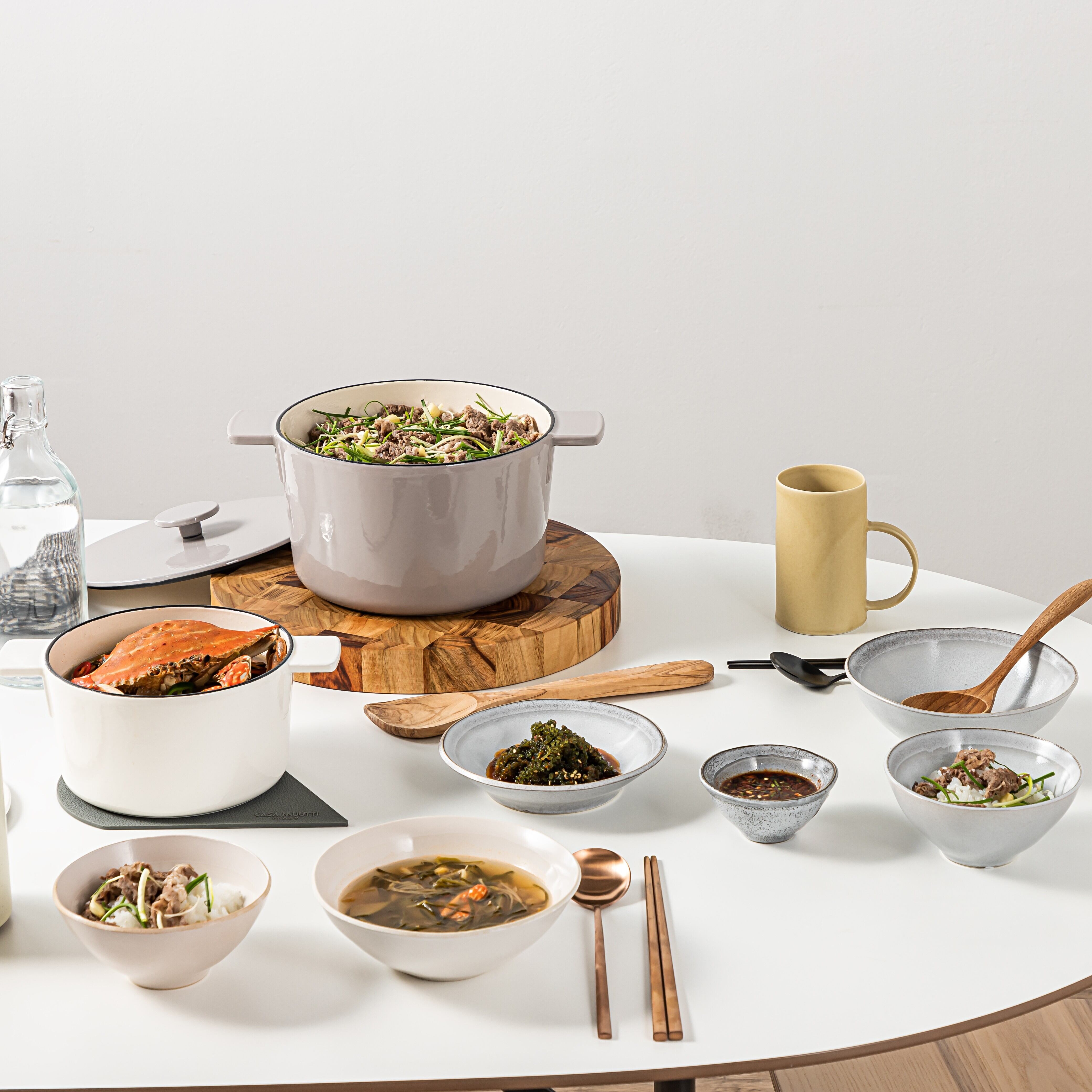 シンプルで洗練されたデザインの鍋は、キッチンのインテリアとしても映えます。ウォームグレーの美しいトーンが、料理を引き立て、食卓を華やかに演出します。