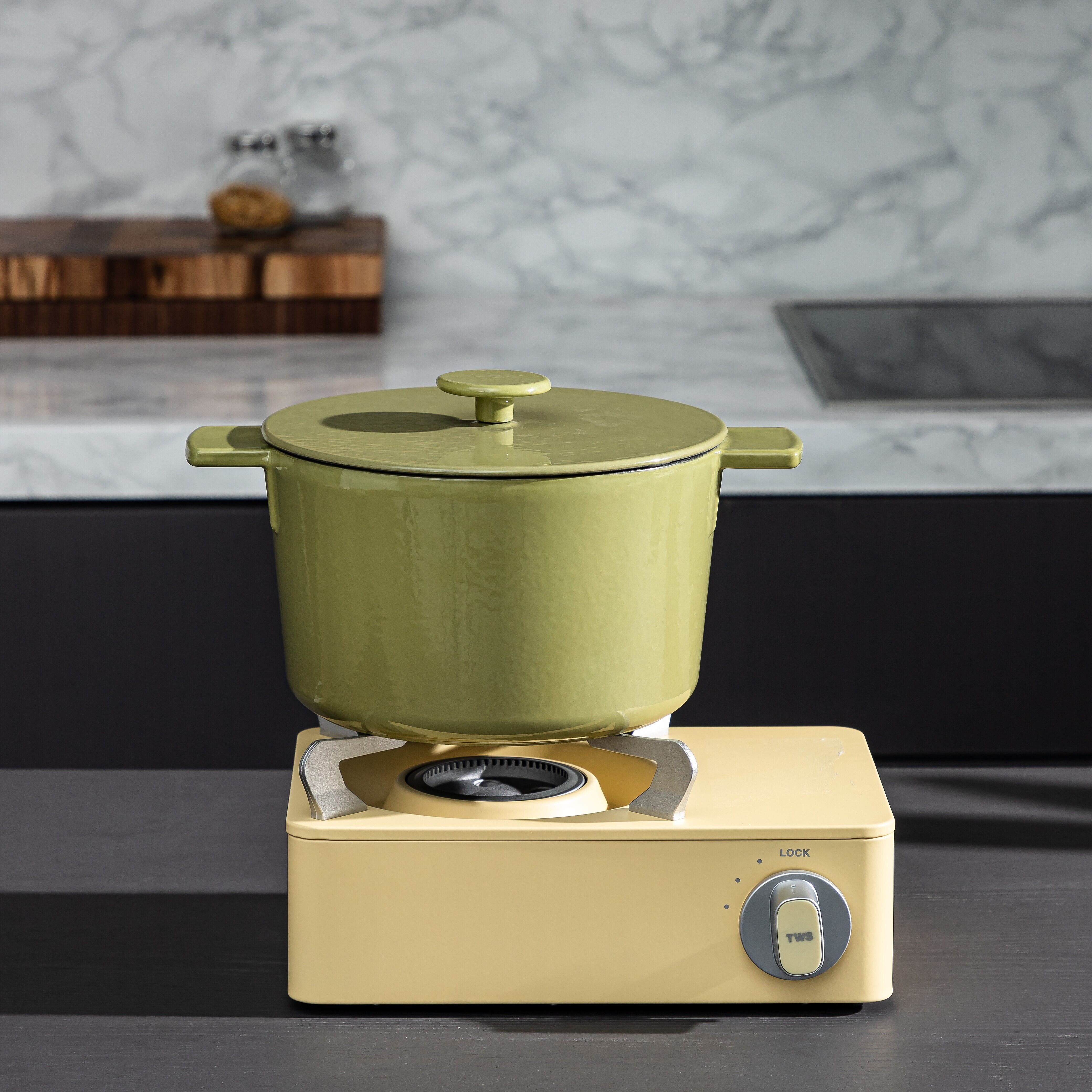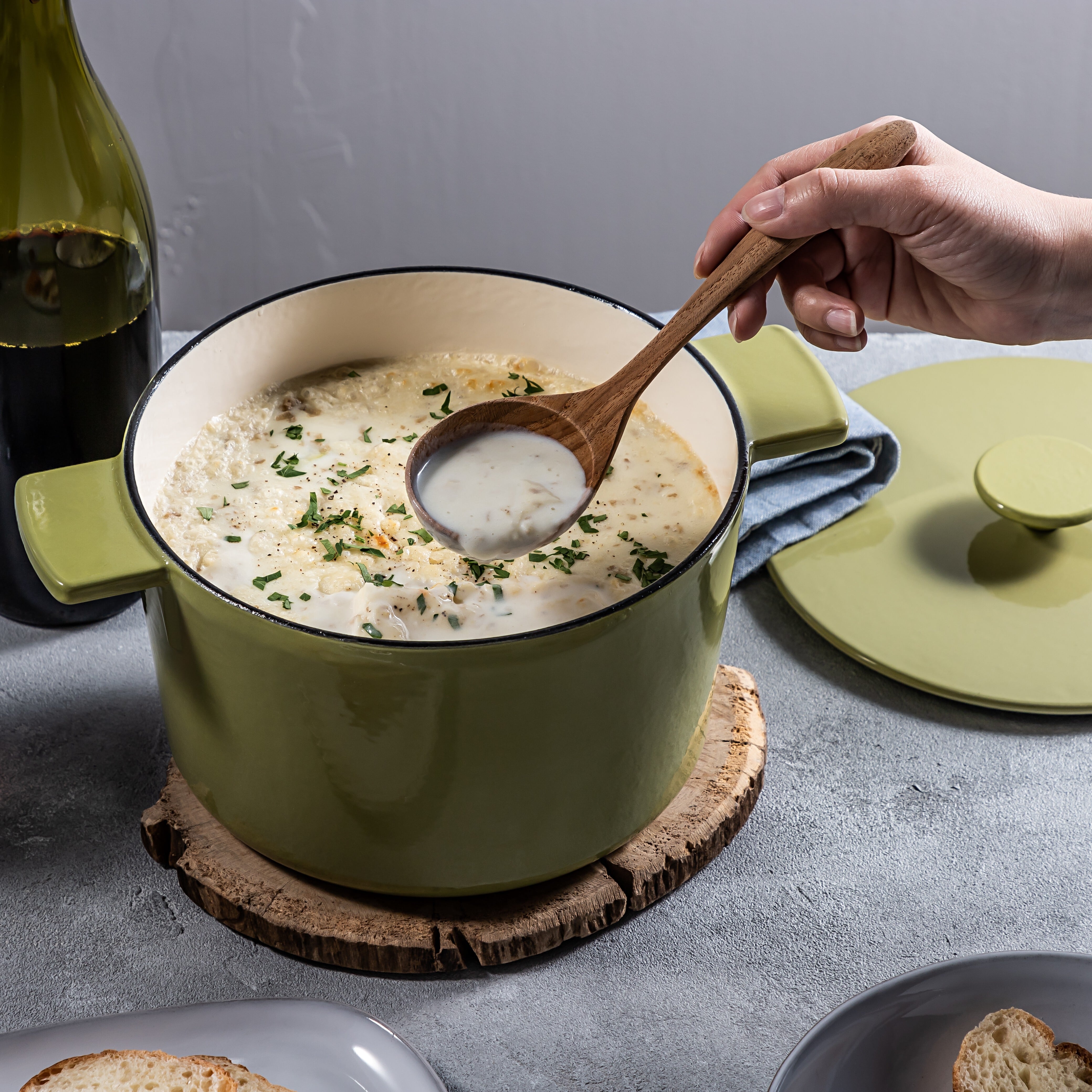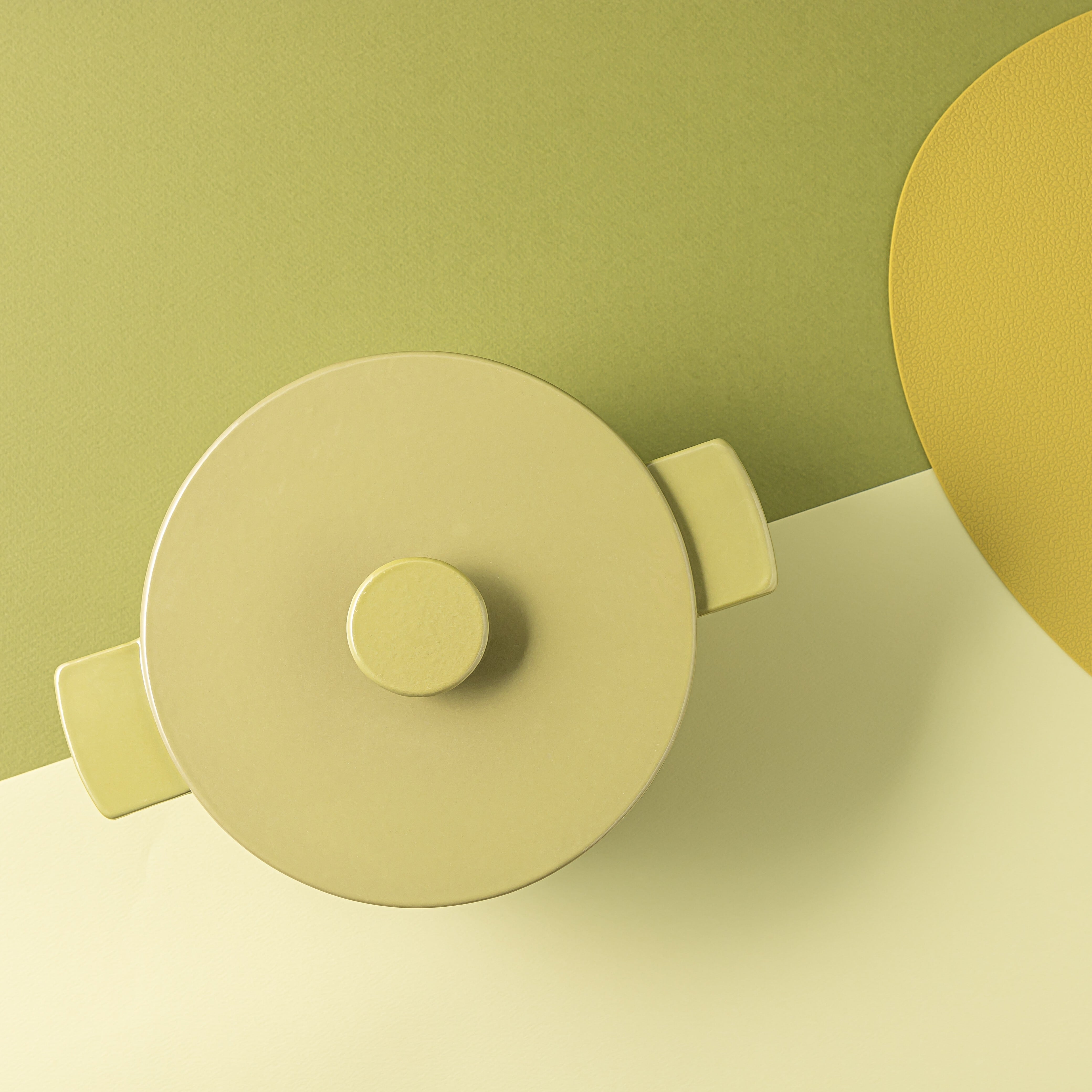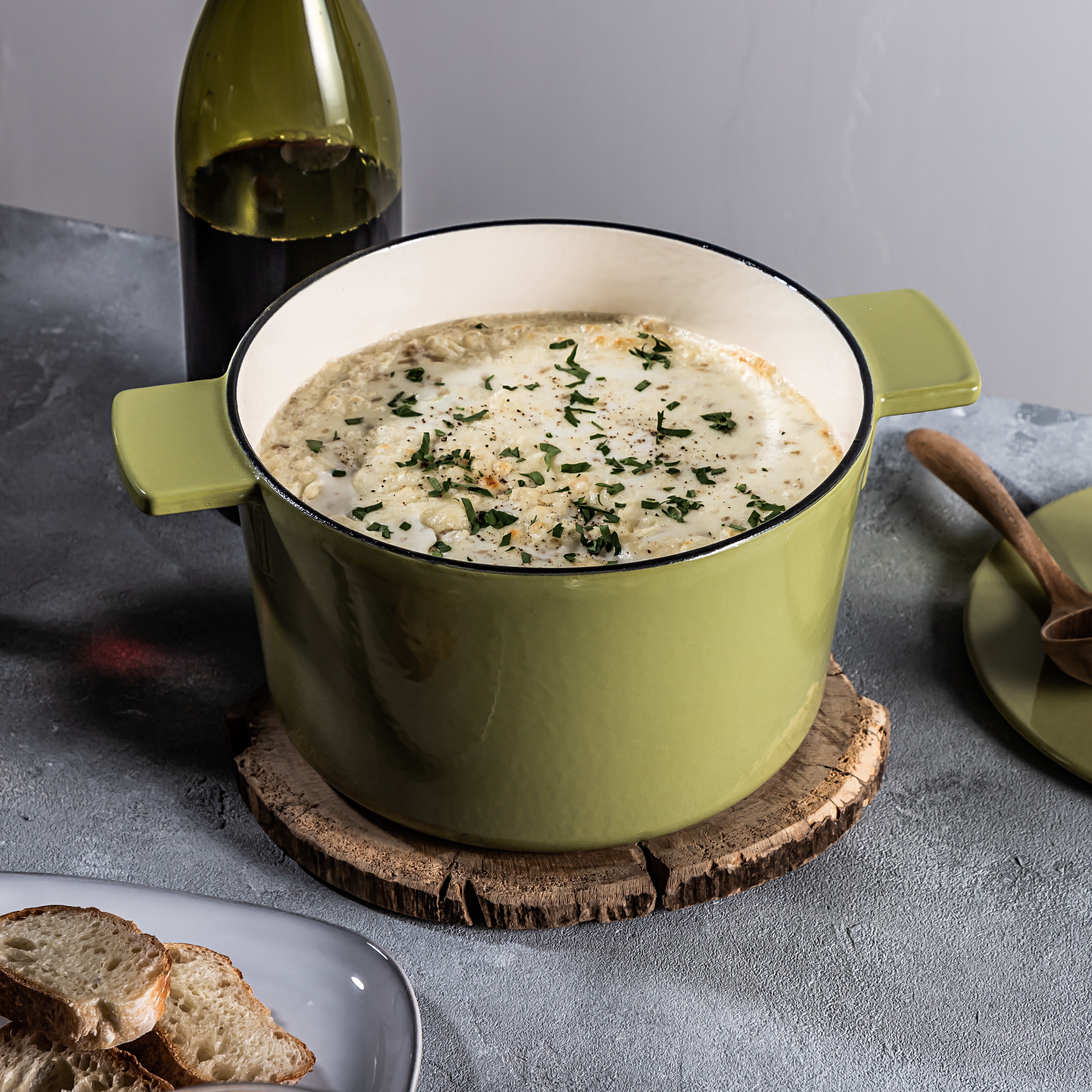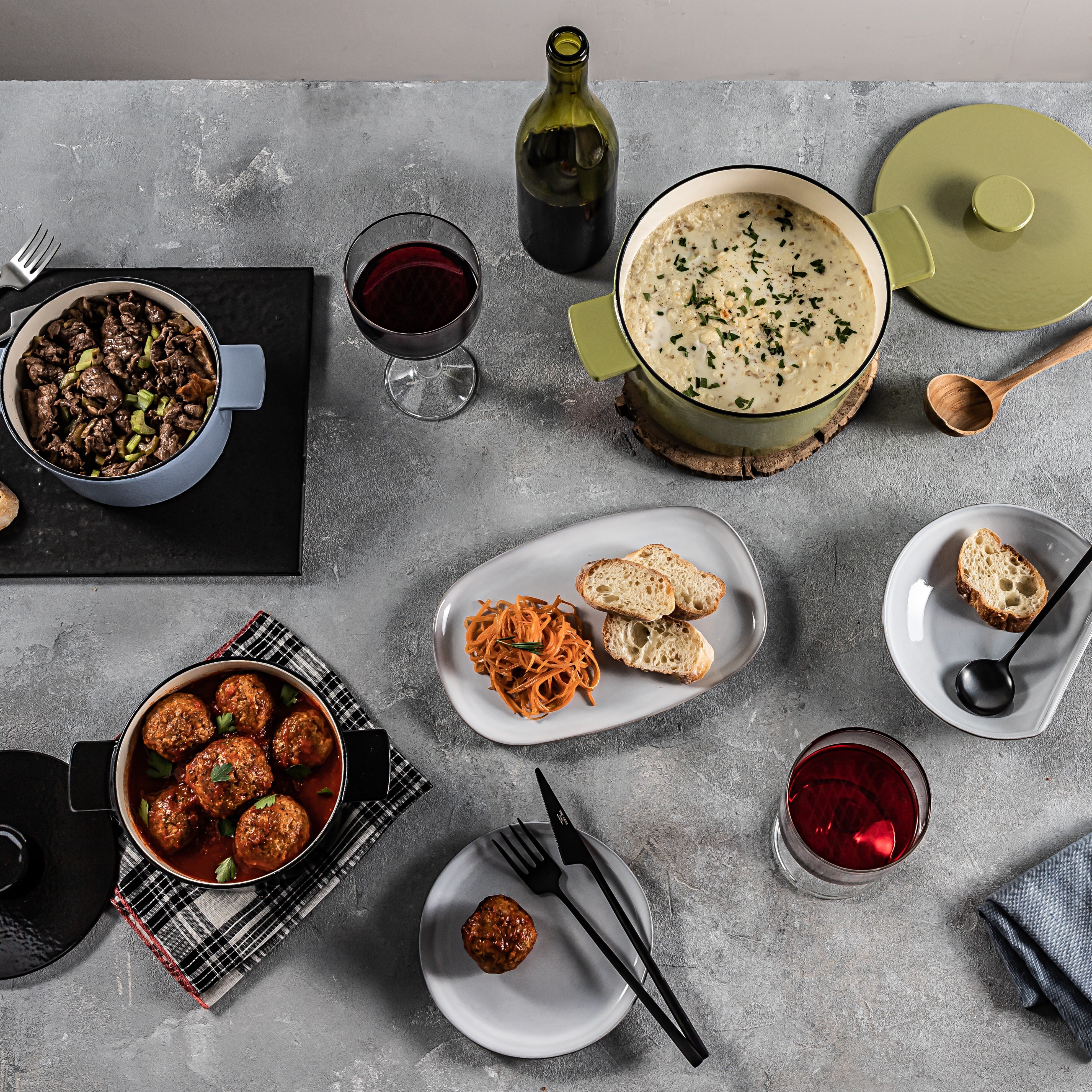 洗練されたデザインの鍋は、キッチンのインテリアとしても映えます。オリーブの美しいトーンが料理を引き立て、食卓を明るく彩ります。
