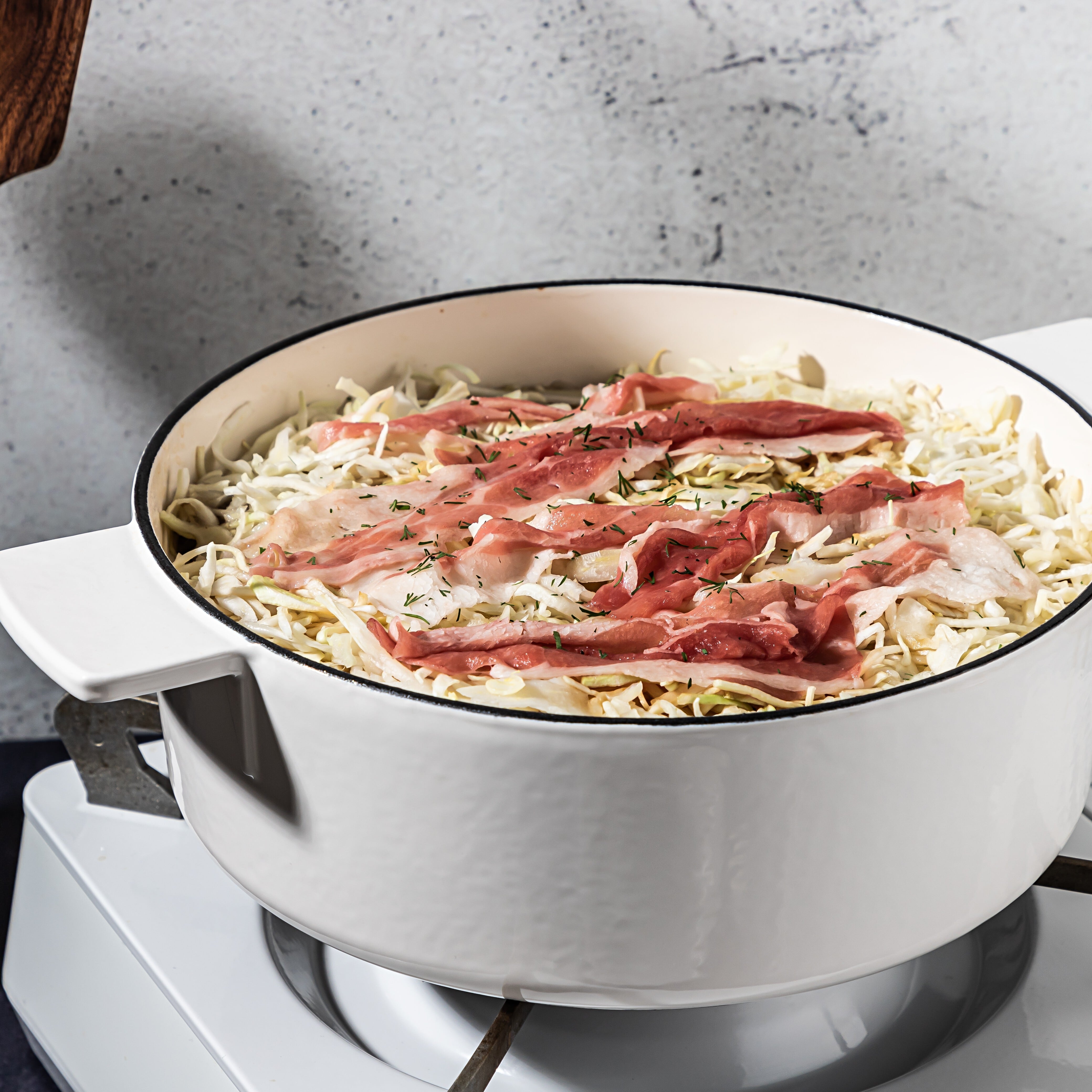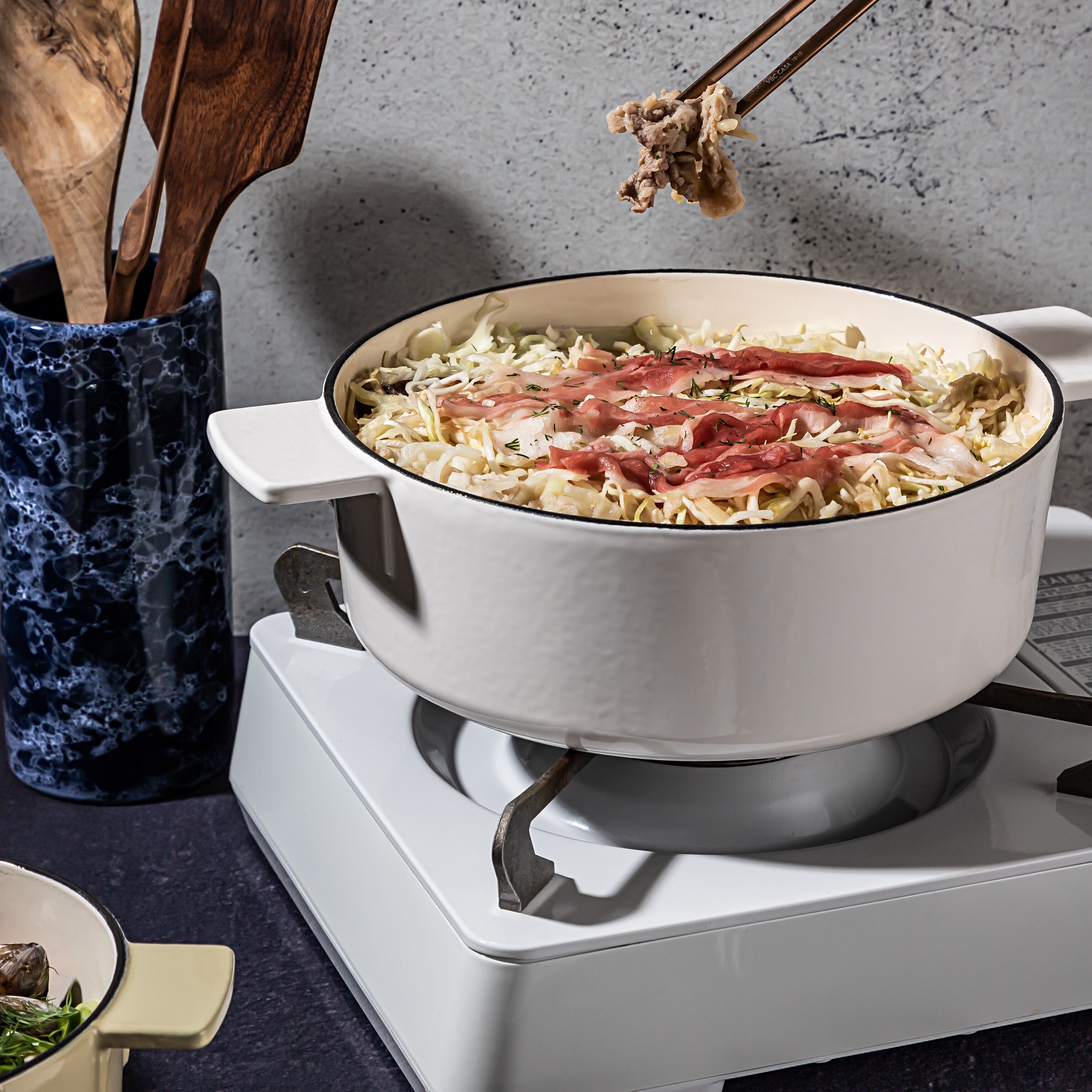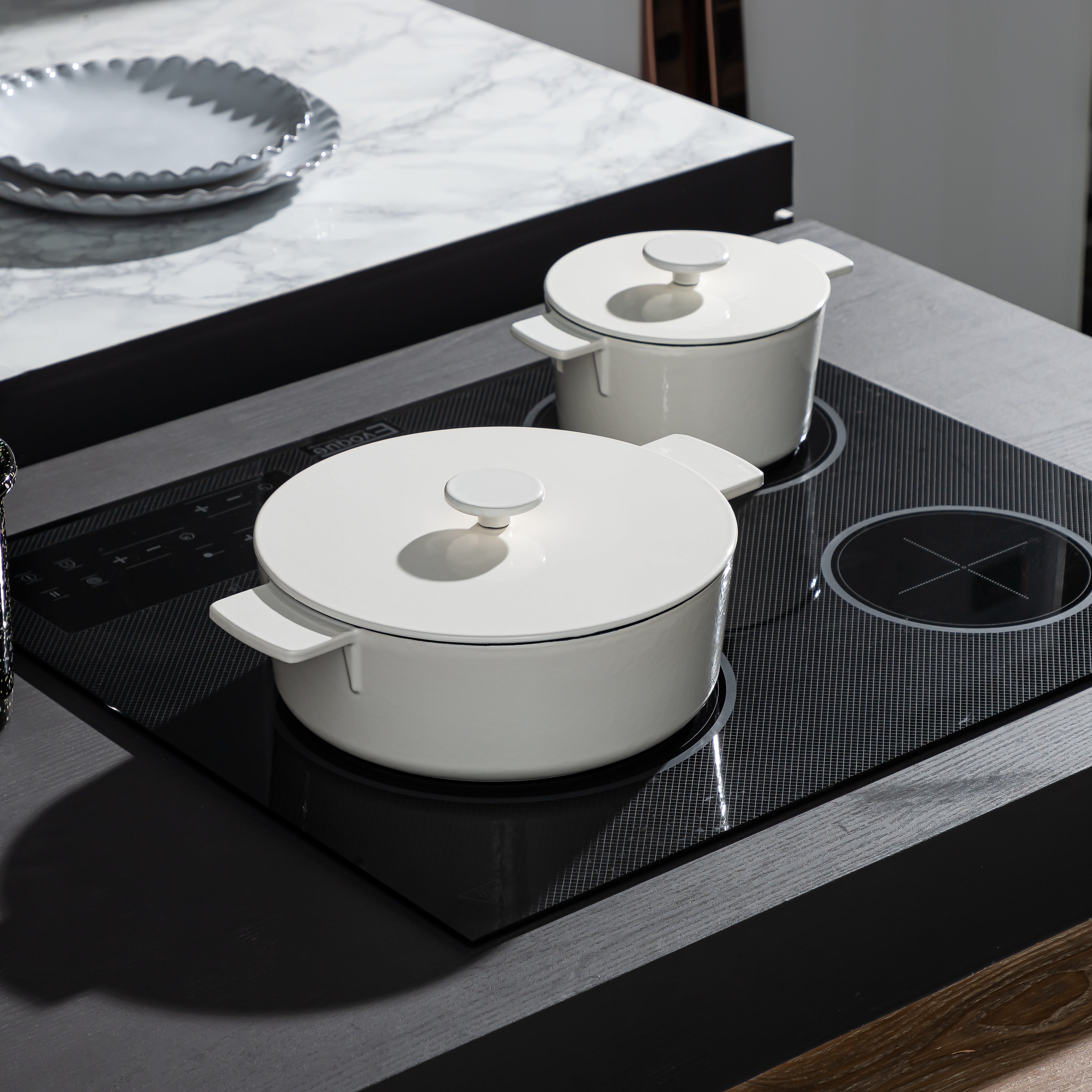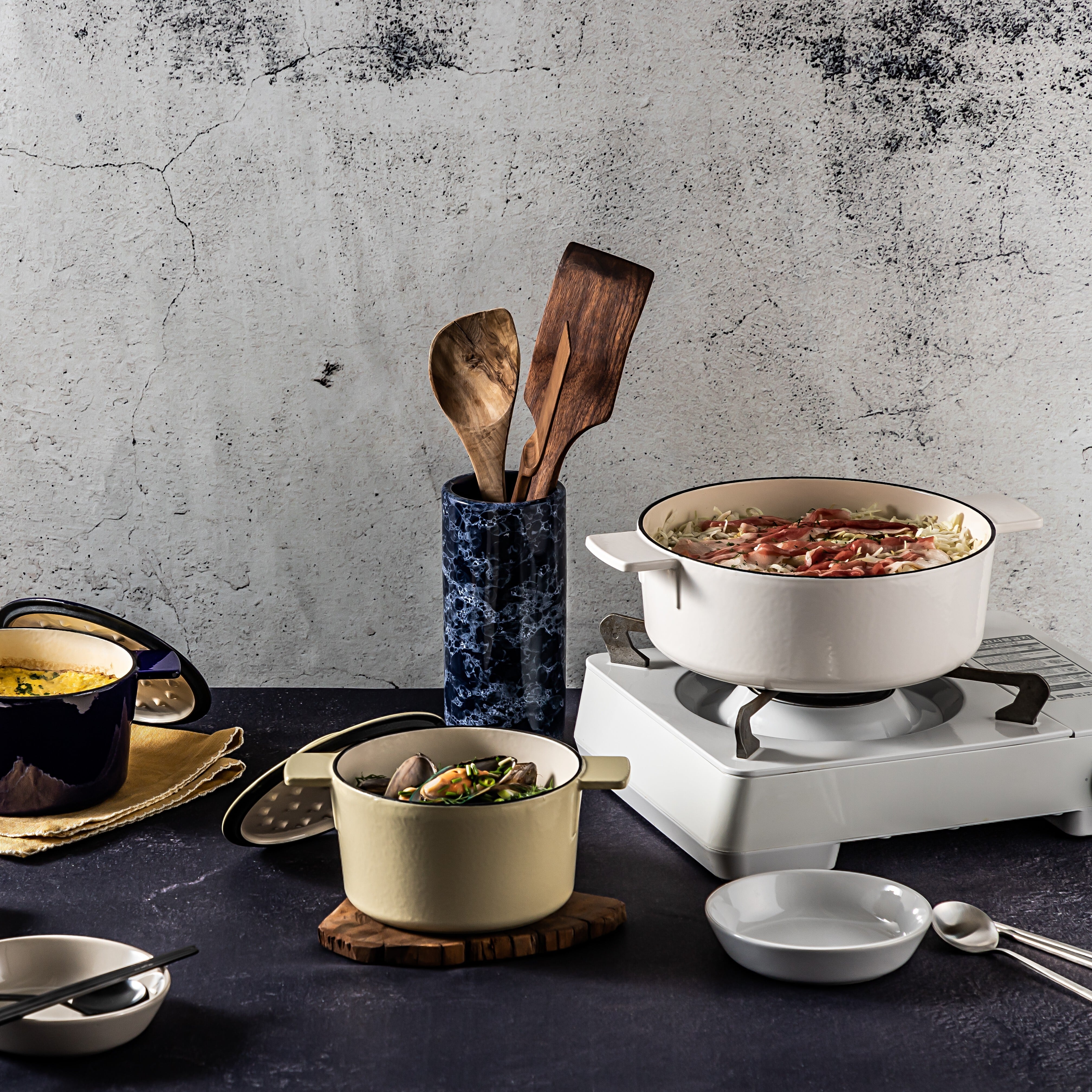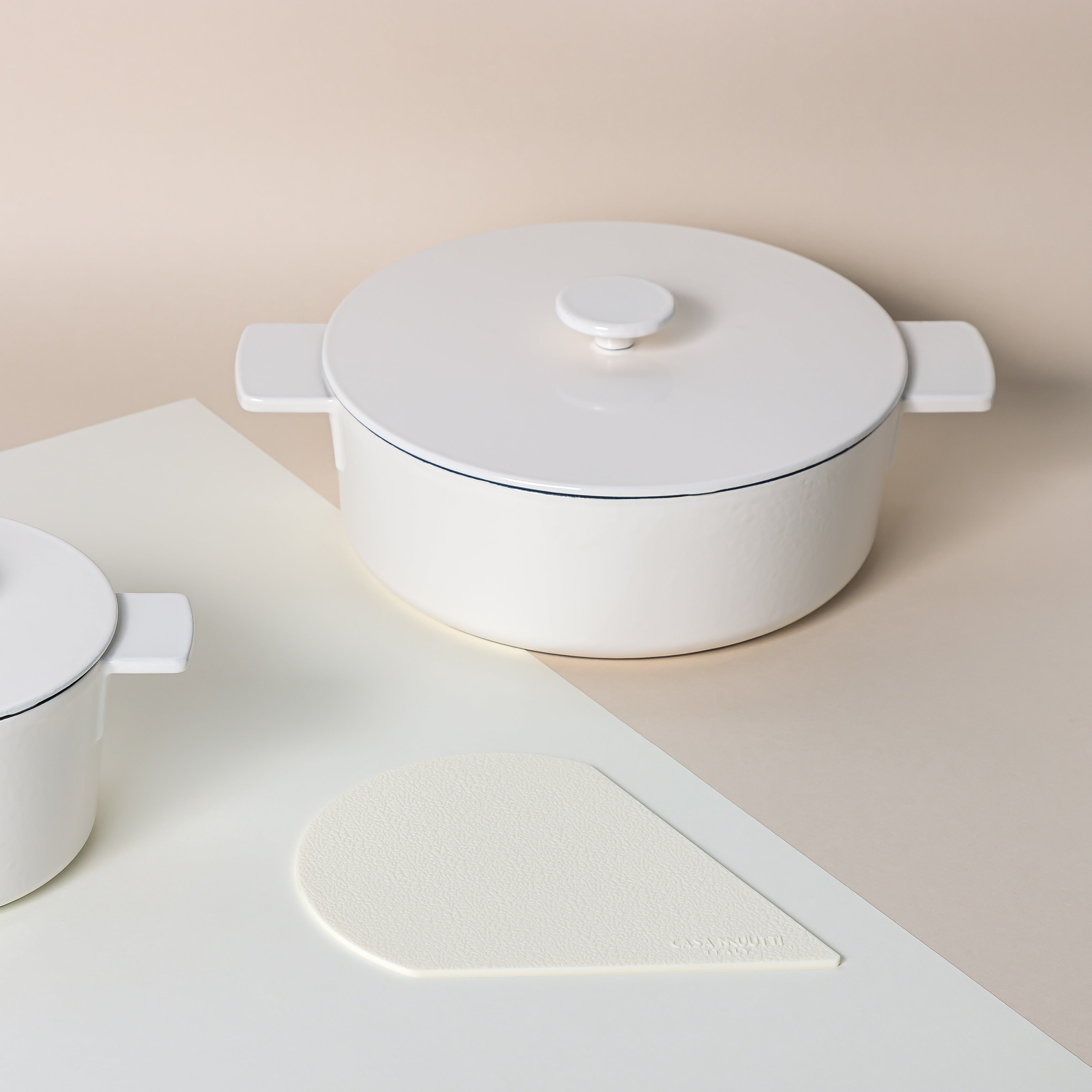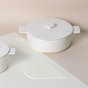 洗練されたデザインの鍋は、キッチンのインテリアとしても映えます。ホワイトの美しいトーンが料理を引き立て、食卓を明るく彩ります。